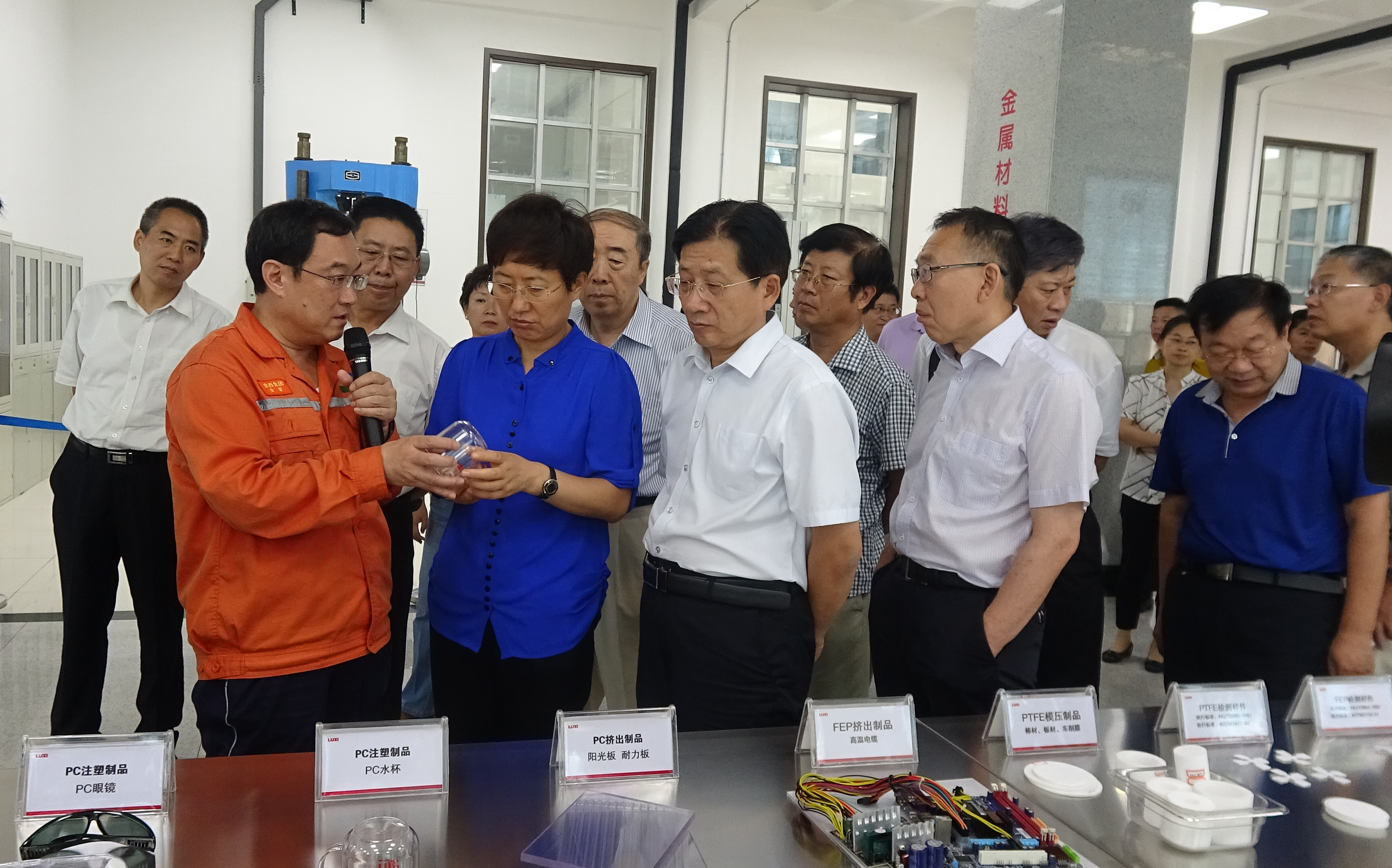 (圖三:領導一行在新材料實驗區了解集團聚碳酸酯產品的試件性能和產品市場情況。)