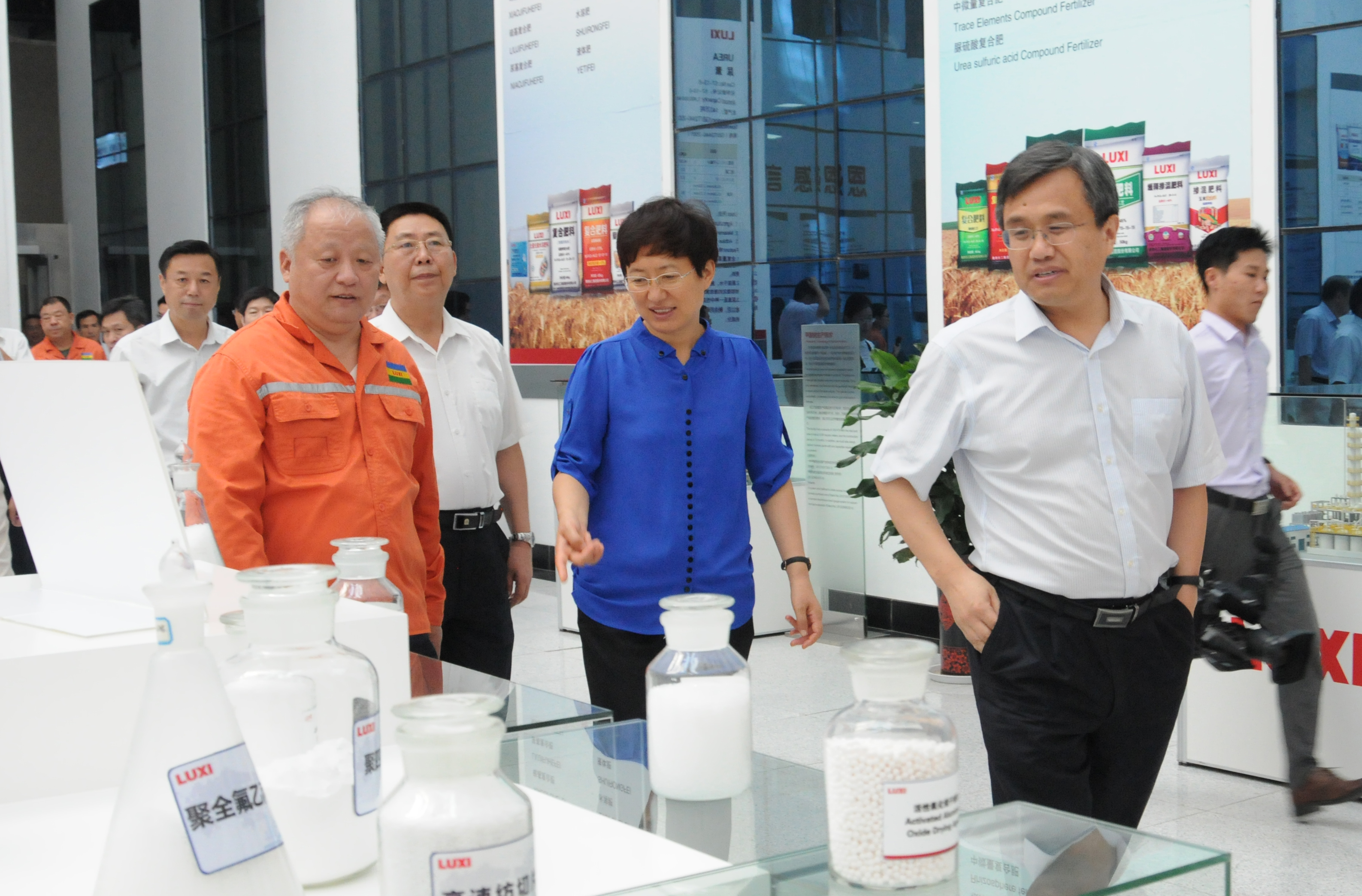 在產品展廳,張金成董事長匯報了集團近年來逐步實現由傳統化肥向基礎化工,由基礎化工向化工新材料轉型的做法,以及下一步的發展方向。王省長在現場看到集團研發的適應市場需求的化肥產品、品種多樣的化工產品、精工制造的各類化工裝備產品時,十分高興。