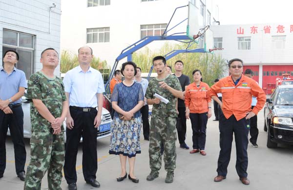 領(lǐng)導一行先后參觀了園區(qū)生產(chǎn)裝置、項目建設現(xiàn)場、應急救援中心、實訓基地、運行指揮中心和產(chǎn)品展廳。在應急救援中心,于娜政委實地了解了救援中心的營房建設、設施器材配備、應急救援指揮平臺建設等情況,并現(xiàn)場觀摩了隊員們的體能訓練、技術(shù)競賽科目演練,以及56米高空救援車和渦噴救援車的出水操作模擬演練情況。在運行指揮中心,領(lǐng)導們通過智慧化工園區(qū)平臺詳細了解了集團在安全、環(huán)保、消防應急、節(jié)能和電商物流等方面的智能信息化管控情況。