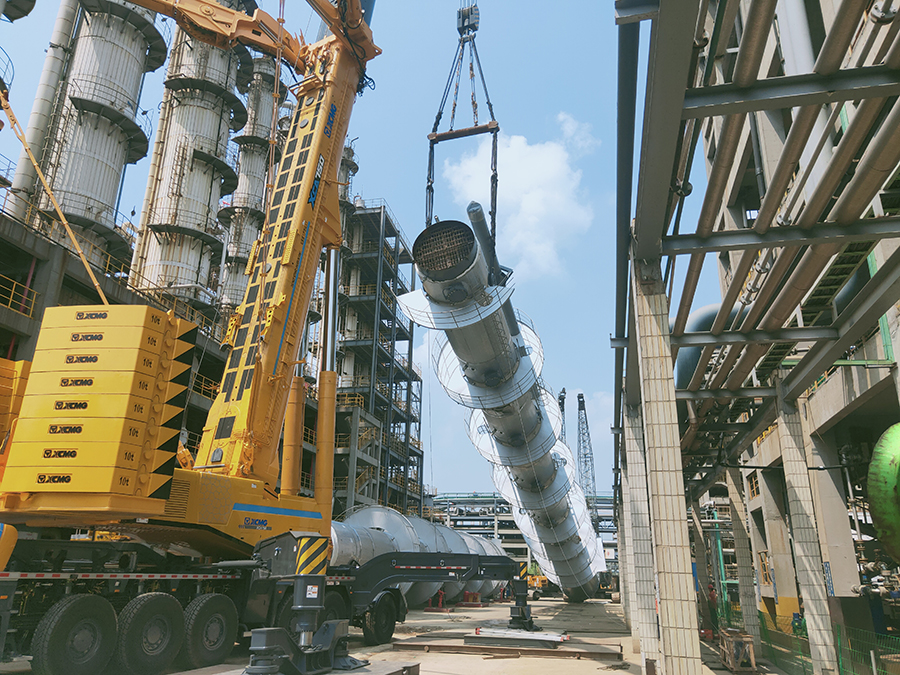 比如甲胺項(xiàng)目的14臺(tái)高塔,直徑大、高度高、保溫厚,現(xiàn)場(chǎng)場(chǎng)地狹小,設(shè)備倒運(yùn)及吊裝難度較大,且脫氨塔、分離塔、脫水塔、甲醇回收塔必須分段吊裝,加大了施工難度。為保障四臺(tái)高塔順利吊裝就位,事業(yè)部上下齊心,堅(jiān)持“一盤棋”思想,將四臺(tái)高塔每一段平臺(tái)爬梯及保溫任務(wù)分配至車間及安裝隊(duì),編制詳細(xì)施工、倒運(yùn)、吊裝及對(duì)口計(jì)劃。全過程黨員干部現(xiàn)場(chǎng)帶領(lǐng)員工加班加點(diǎn),保證各環(huán)節(jié)無縫銜接。最終順利完成甲胺項(xiàng)目高塔設(shè)備一體化、模塊化吊裝,為后續(xù)設(shè)備和管道安裝奠定了基礎(chǔ),鼓舞了士氣。