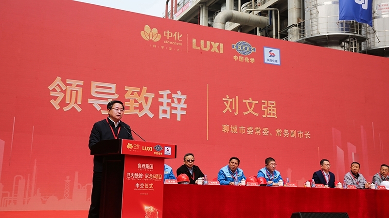 中交儀式上,市委常委、常務(wù)副市長劉文強(qiáng)向奮戰(zhàn)在建設(shè)一線的建設(shè)者們表示衷心的感謝和誠摯的問候。他指出己內(nèi)酰胺·尼龍6項(xiàng)目的建成,標(biāo)志著魯西集團(tuán)向高端化工新材料產(chǎn)業(yè)基地又邁出了堅(jiān)實(shí)的一步。在迎接新中國成立75周年之際,項(xiàng)目如期中交,既是魯西集團(tuán)貫徹市委市政府“轉(zhuǎn)方式、調(diào)結(jié)構(gòu)、提質(zhì)量、增效益”部署要求的具體行動,也是借助中國中化研發(fā)平臺和產(chǎn)業(yè)鏈優(yōu)勢,繼續(xù)深耕化工新材料領(lǐng)域的重要成果,對聊城市加速構(gòu)建“435”產(chǎn)業(yè)布局,打造綠色化工千億級產(chǎn)業(yè)集群具有重要意義。