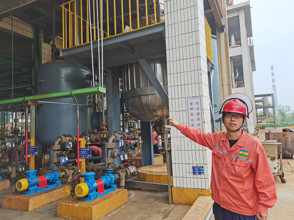 當(dāng)走到不遠(yuǎn)處的一套正在運行的塔罐機(jī)泵前,一位年輕的員工興致勃勃的說:“這是一套廢料回收系統(tǒng),它的主要作用是把系統(tǒng)內(nèi)無法處置的廢料集中重新過濾吸收,進(jìn)行循環(huán)再利用。其中除了部分螺絲螺栓外,所有的設(shè)備、管線都是利用集團(tuán)其他裝置上一些閑置或者淘汰的廢舊設(shè)備、管線進(jìn)行改造的,完全由我們自主設(shè)計、自主施工、自主調(diào)試投運,現(xiàn)在已經(jīng)投入使用兩個月了,從前沒法處置的廢料現(xiàn)在經(jīng)這套系統(tǒng)回收處理后全部達(dá)到循環(huán)再利用,運行效益不計,僅技改成本,就節(jié)省了近100萬元!”