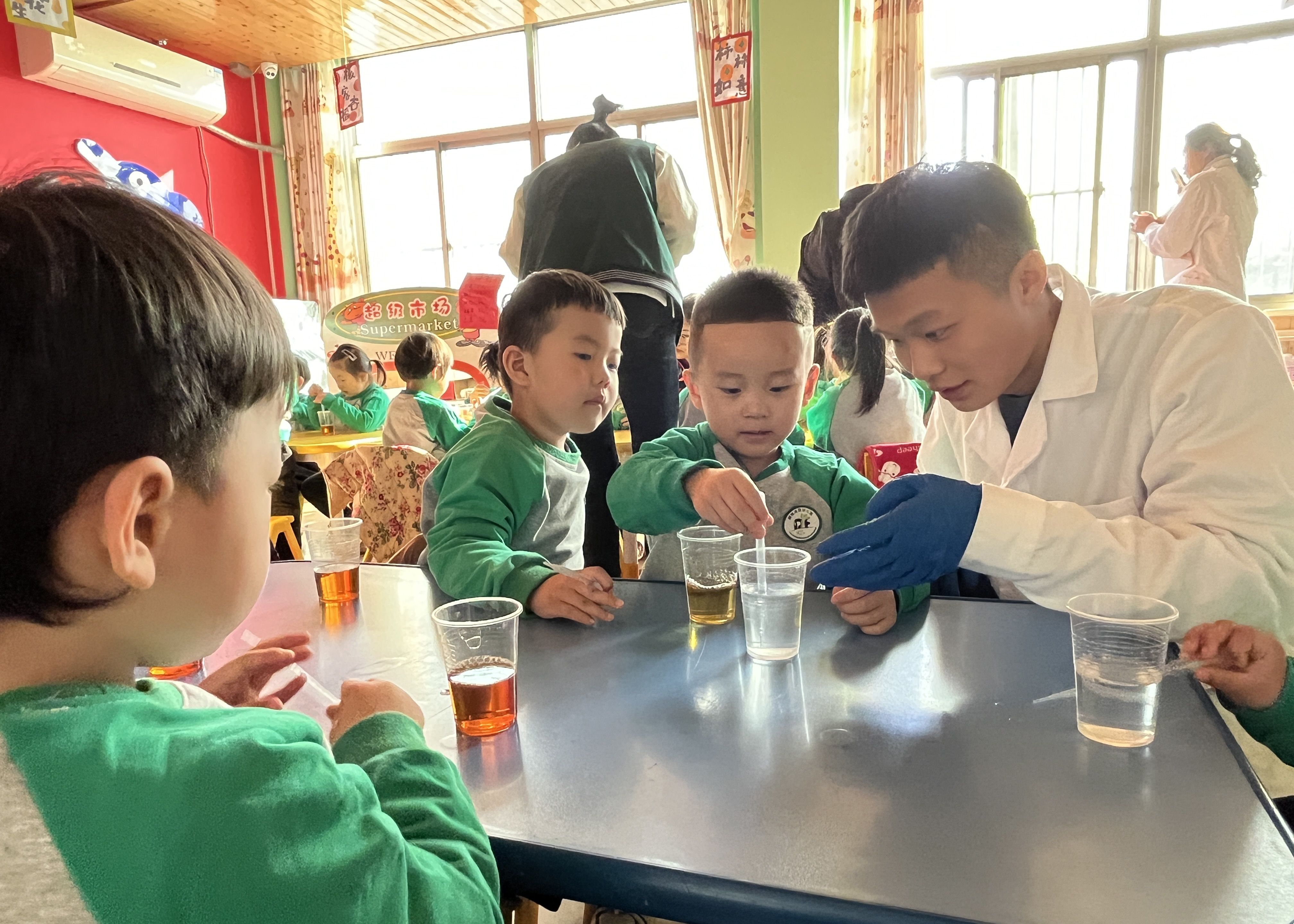 海源幼兒園中二班的教室里不時傳來小朋友的的歡呼聲,“顏色變了、顏色變了.....”小朋友們瞪大了眼睛觀看燒瓶中液體顏色的變化,隨著溶液顏色的變化爆發出來熱烈的掌聲。在這愉快的氛圍中,魯西化工工程學院的志愿者和孩子們共同完成了一次魔法實驗課。臨別之際,海源幼兒園園長王艷高興地說道:“看到孩子們天真無邪的笑臉和充滿好奇的眼睛,感謝你們給孩子們的人生帶來了生動的科普實驗課。”